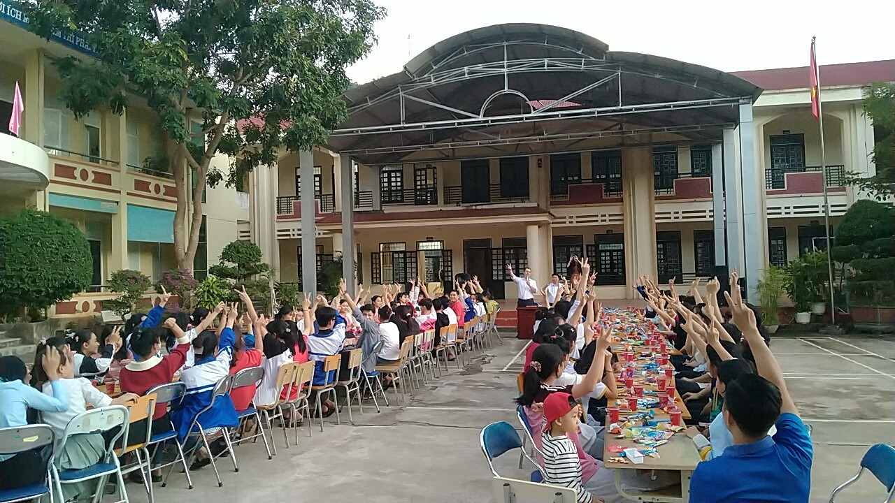 Các em học sinh cùng các thầy cô giáo đồng lòng hô vang CHIẾN THẮNG trong cuộc gặp mặt.