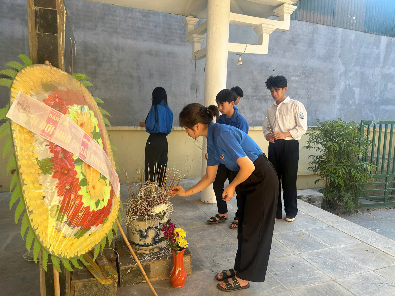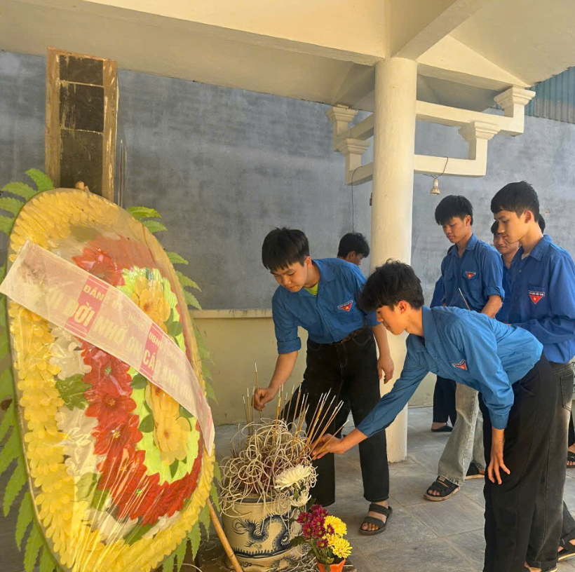Ngay từ đầu buổi chiều, đoàn viên thanh niên trong màu áo Đoàn xanh quen thuộc, cùng các thầy cô giáo, đã tập trung tại đài tưởng niệm các anh hùng liệt sĩ của địa phương để dâng hương, viếng đài. Trong không gian trang nghiêm, từng nén hương được thắp lên bằng tất cả lòng thành kính, từng phút mặc niệm lắng đọng như nhắc nhở mỗi người về sự hi sinh anh dũng của những người con ưu tú đã ngã xuống vì độc lập, tự do của Tổ quốc.